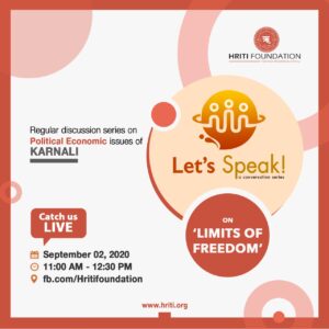 • Let’s SpeakLet’s Speak is a regular discussion program on economic-political issues of Karnali Province. This event is held on the first and third wednesday of every month. Young and intellactual people discuss on current issues, make input on sound public policy. This program aims to bring policy makers and young intellactuals together to develop alternative ideas on public policy. This program has been organizing continuously since the establishment of Hriti Foundation.